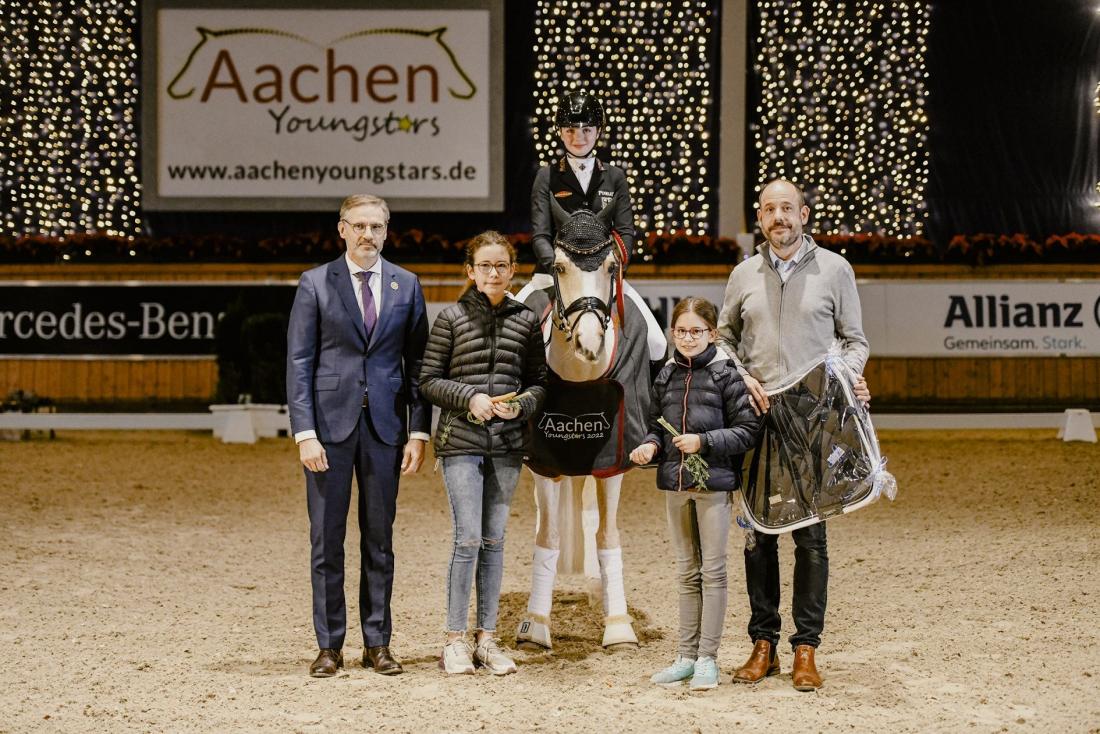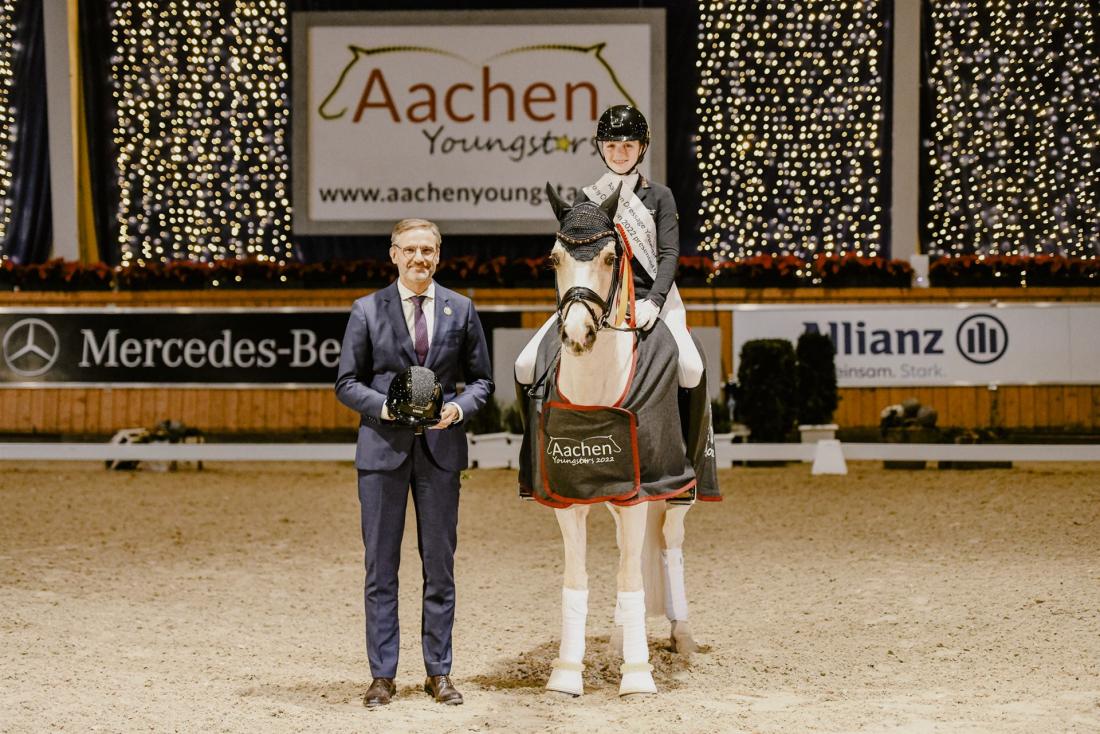 Das macht ihnen so schnell keiner nach: Rose Oatley und Daddy Moon gewinnen auch ihre dritte Prüfung bei den Aachen Dressage Youngstars 2022 – den Prize of BFT Cognis GmbH. Und das deutlich: Für ihre Kür zu der Musik von Star Wars erhalten sie von den Richtern 83,517 Prozent. Erster Hattrick.
