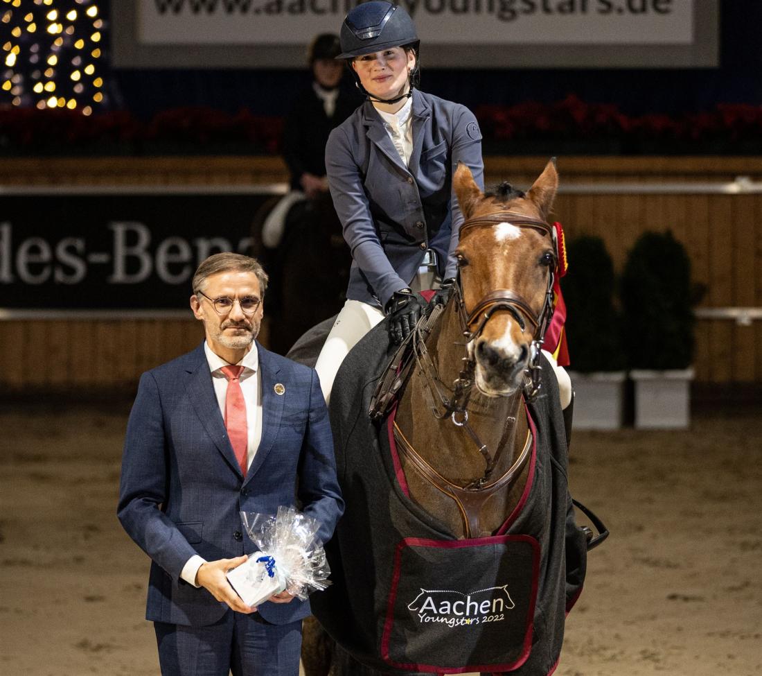 „Als erste zu reiten, ist immer schwierig“, sagte Romy Rosalie Tietje kurz nach ihrem Ritt und fügte mit einem Schmunzeln hinzu: „Also habe ich es einfach so gemacht, wie ich dachte, dass es am besten ist.“ Und die 17-Jährige sollte Recht behalten. Das Tempo, mit dem die Schleswig-Holsteinerin gemeinsam mit ihrem Cascadino durch den Parcours gefegt war, war an diesem Abend in der vollbesetzen Albert-Vahle-Halle das Maß der Dinge. „Mein Pferd hat das großartig gemacht“, schwärmte Romy über ihren Wallach, der seit vier Jahren ihr treuer Sportpartner ist. „Ich bin so glücklich, ihn an meiner Seite zu haben. Er hat einfach noch nie etwas falsch gemacht.“ Und das war auch heute so. Die flotte und fehlerfreie Runde des Traumpaares von der RG Gestüt Heidberg e.V. schien nicht zu schlagen zu sein. Zittern musste Romy aber dann doch einmal kurz beim Ritt von Mick Haunhorst aus Weser-Ems. Das Mitglied des CHIO Aachen CAMPUS-Exzellenz Programms gab mit seiner Valentina by Boris ordentlich Gas und musste sich am Ende nur knapp geschlagen geben (0/38,04). Über Platz drei freute sich der Deutsche Juniorenmeister Max Merschformann mit Dorotheental's Classica (0/40,79). Morgen fällt bei den Junioren im STAWAG-Preis die Entscheidung um den Titel des Hallenchampions. Die Ausgangslage von Romy Rosalie Tietje ist hervorragend. Die Nachwuchsreiterin aber bleibt gelassen. „Erstmal freue ich mich riesig über den heutigen Sieg. Das ist hier in Aachen etwas ganz Besonderes“, so die 17-Jährige. „Und dann schauen wir mal, was morgen für uns möglich ist.“