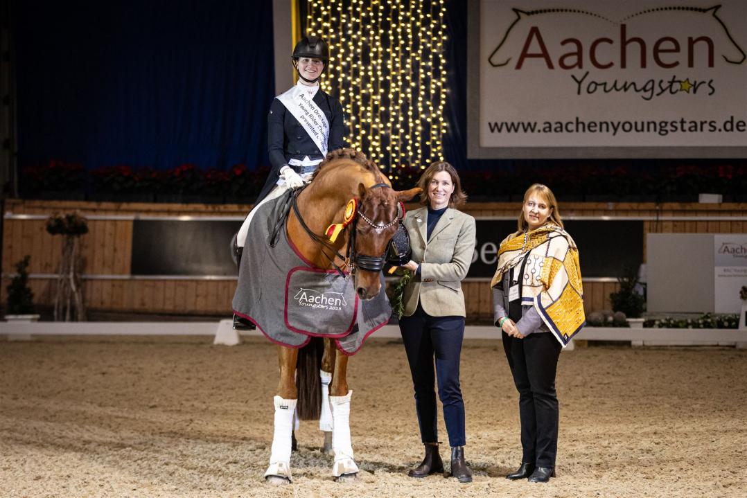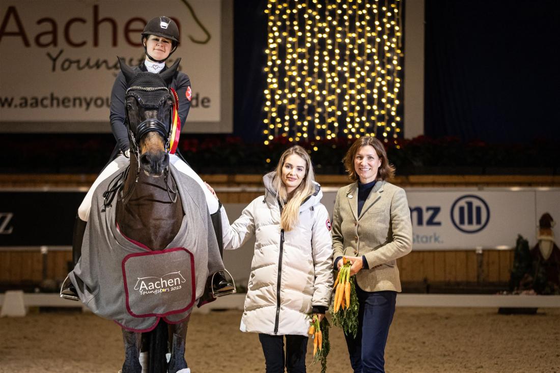 Bei Theresa Nabbefeld und ihrem Devalero lief es in der Kür einfach wie am Schnürchen. Wohlüberlegt setzte die junge Westfälin die Stärken ihres 13-jährigen Sportpartners zu den Klängen von Disney’s Vaiana in Szene. „Es war ein unglaublicher Ritt heute“, strahlte Theresa Nabbefeld. „Mein Pferd hat sich fantastisch angefühlt und wir waren die ganze Kür über super passend zur Musik.“ Das sahen auch die drei Juroren so und belohnten die Leistung der beiden mit einer neuen persönlichen Bestleistung von 74,842 Prozent. „Und das reichte aus, um die Siegerin der beiden Vortage, Emma Caecilia Lienert und deren Express (74,275 Prozent) auf Rang zwei zu verweisen. Die Freude von Theresa Nabbefeld war entsprechen groß: „Ich bin das erste Mal hier in Aachen. Die Atmosphäre in dieser Halle ist wirklich ganz besonders und ich bin überglücklich, dass wir heute hier ganz vorne stehen dürfen.“ Für Theresa Nabbefeld war der Sieg im Preis der Familie Hans-Peter Simons darüber hinaus ein goldener Abschluss ihrer Junge-Reiter-Zeit: „Das ist gerade ein ganz emotionaler Moment für mich.“ Über Rang drei freute sich mit der Schwedin Laura Lausten und Fairy Tale ein Mitglied des CHIO Aachen CAMPUS Exzellenz-Programms.