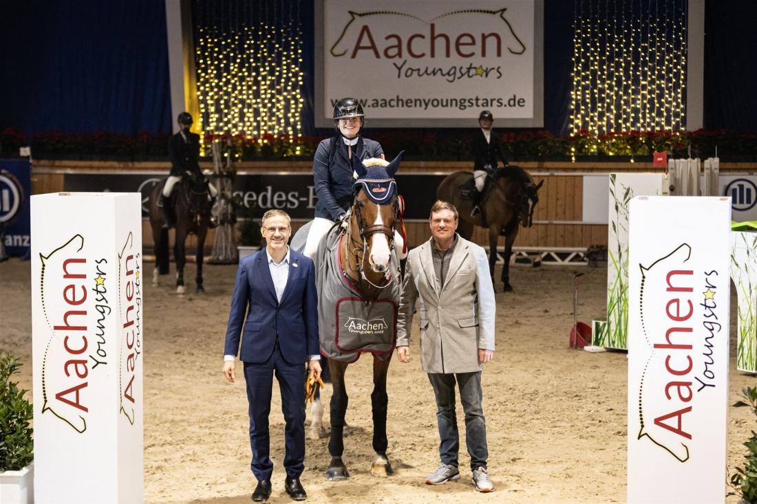 Am Ende lag eine kleine Welt zwischen Hannah-Michelle Wilken und der Konkurrenz. Im Sattel ihrer langjährigen Sportpartnerin Never Mind zauberte die 19-Jährige nicht nur eine fehlerfreie, sondern zugleich pfeilschnelle Runde in den Aachener Sand. 63,80 Sekunden prangten im Ziel auf der großen Anzeigentafel. Damit lagen die beiden in der 2. Wertungsprüfung der Jungen Reiter fast fünf Sekunden vor Moritz Baum aus Weser-Ems mit All In (0/68,15 Sekunden) und Charlotte Höing aus Berlin-Brandenburg mit Caboom (0/69,23 Sekunden). „Die Stute ist sehr speziell und komplett auf mich fixiert“, so die junge Westfälin über ihre 10-jährige Numero Uno-Tochter und fügte mit einem Strahlen im Gesicht hinzu: „Gestern war sie noch sehr aufgeregt, aber heute hat wirklich alles geklappt und wir haben einfach jede Distanz genau passend erwischt.“ Und genau dieses Gefühlt war es, dass den Triumph am späten Samstagabend für Hannah-Michelle Wilken so besonders machte. Denn siegreich war sie bei den Aachen Jumping Youngstars schon einige Male. „Ich bin jetzt das dritte Jahr hier und konnte jetzt in jedem Jahr mindestens ein Springen gewinnen“, so die Reiterin aus Warendorf. „Das ist wirklich ein großartiges Gefühl. Die Atmosphäre in dieser Halle ist einfach besonders.“ Und eben dieser Atmosphäre soll die beiden auch am morgigen Sonntag beflügeln. Dann nämlich steht für Never Mind eine Premiere auf dem Programm. Das erste Mal wird Hannah-Michelle Wilken ihre Sportpartnerin dann in einem S-Springen auf Drei-Sterne-Niveau an den Start bringen: „Wenn sie so drauf ist wie heute, ist alles möglich.“