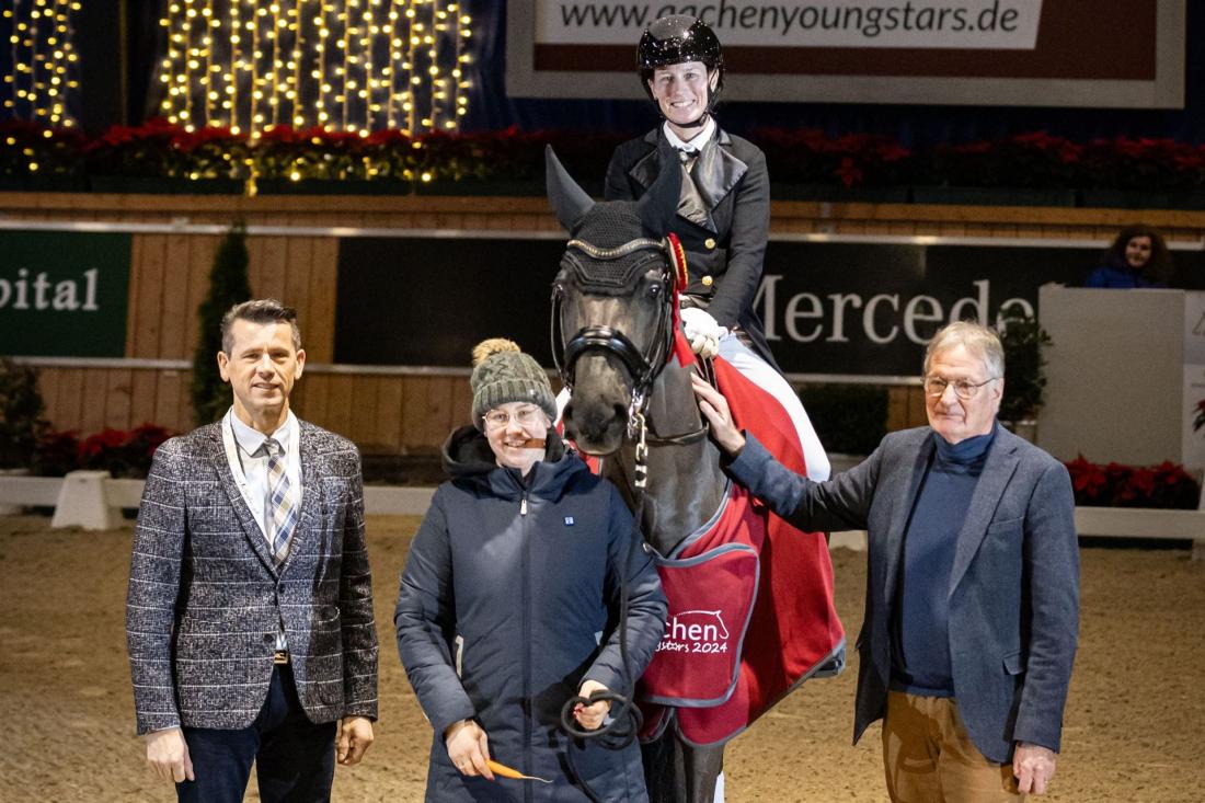 Helen Langehanenberg weiß wie es sich anfühlt, in Aachen zu gewinnen. 2012 und 2013 war sie im benachbarten Deutsche Bank Stadion im Sattel des legendären Damon Hill beim CHIO Aachen die umjubelte Siegerin im Lindt-Preis. In der Albert-Vahle-Halle war sie hingegen noch nicht am Start. Das holte sie heute nach. Und wie! Mitgebracht in die Soers hatte sie ihren Nachwuchs-Star DSP Danny Cool. Und der machte seinem Namen in der weihnachtlich geschmückten Halle alle Ehre. Cool und routiniert meisterte der neunjährige Danciano-Sohn, der im vergangenen Jahr bereits als Drittplatzierter im Finale des Nürnberger Burgpokals auf sich aufmerksam machte, die Lektionen der schwersten Klasse. „Ich bin schwer verliebt in mein Pferd“, freute sich die 42-Jährige vom RV St. Georg Münster e.V. über die Leistung ihres Sportpartners. „Ich habe immer an ihn geglaubt und wusste, dass das mit ihm mal etwas ganz Besonderes werden kann. Und ich bin unglaublich froh, dass das anscheinend nicht nur ich so sehe“, freute sich die Westfälin über stolze 73,816 Prozent und den unangefochtenen Sieg im Preis der Hengststation M. Beckmann & Sportpferde L. Winkel. „Wir haben hier wirklich großartige Bedingungen“, so die zweifache Siegerin des Weltcup-Finales. „Wenn hier keine Weihnachtsstimmung aufkommt, dann weiß ich es auch nicht.“
