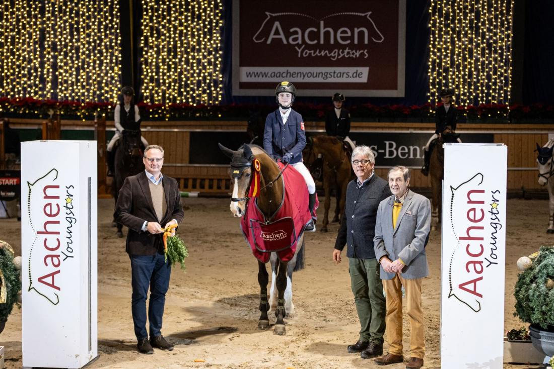 Dem Sieger gratulieren Dr. Stephan Kranz (Aufsichtsratsmitglied des Aachen-Laurensberger Rennvereins) und Robert Flachskampf (Geschäftsführender Gesellschafter der Hubert Flachskampf GmbH Sanitär und Heizung) sowie Willibert Mehlkopf (Turniergründer).