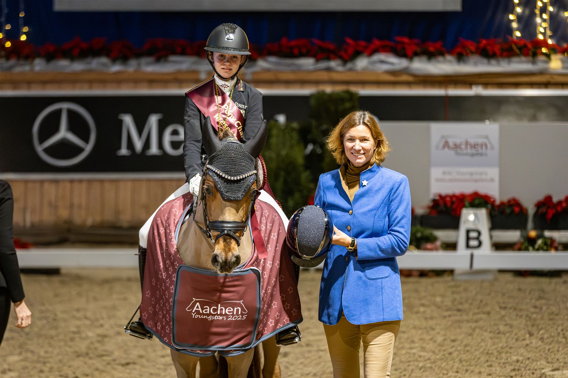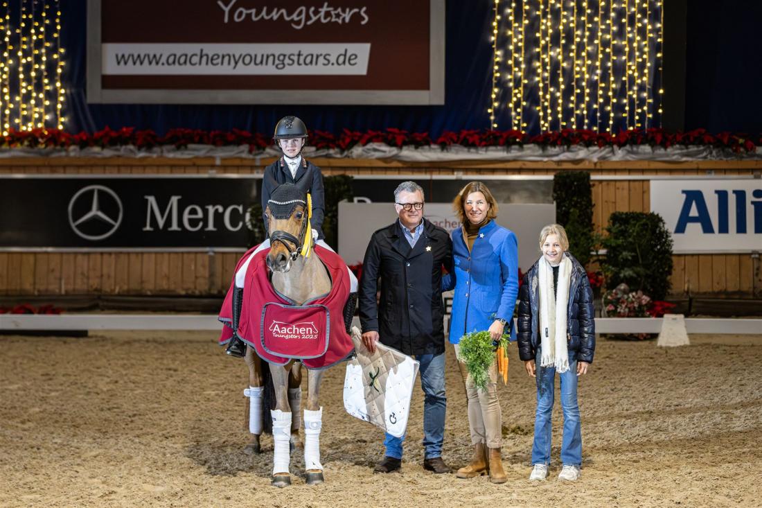 Im Sommer war Laura Kohoutek im französischen Le Mans Doppel-Europameisterin der Children geworden. In der weihnachtlich geschmückten Albert-Vahle-Halle trumpfte die 14-Jährige in der Ponytour auf. Nach den Plätzen drei und zwei in den ersten beiden Wertungsprüfungen schlug in der finalen Kür, dem Elektro Kraemer-Preis, die große Stunde der jungen Nachwuchsreiterin und ihres 15 Jahre alten Wallachs Der kleine Sunnyboy WE. Nach einer mit Schwierigkeiten gespickten Kür leuchtete mit stolzen 77,225 Prozent eine neue persönliche Bestleistung auf der Anzeigentafel. „Mein Pony ist ein kleiner Frechdachs, aber er weiß auch immer ganz genau, wann es darauf ankommt. Dann gibt er alles“, freute sich Laura Kohoutek nach ihrer gelungenen Kür, für die auch Jurorin Nicole Nockemann, die in dieser Prüfung als Kommentatorin fungierte, lobende Worte fand: „Eine wirklich tolle Vorstellung.“ Mit eben dieser tollen Vorstellung schaffte es Laura Kohoutek das bis dahin beste Ergebnis der amtierenden Mannschafts-Europameisterin Hannah Charlotte Isbruch, die die beiden ersten Wertungsprüfungen für sich entscheiden konnte, noch zu übertrumpfen. Im Sattel ihres achtjährigen Diamond Touch NRW-Nachkomme DSP Der kleine Champion hatte die 16-Jährige 75,892 Prozent vorgelegt. Das reichte am heutigen Tag für Rang zwei. Dritte wurde der Niederländer Téo Rouyr, der gemeinsam mit seinem zehnjährigen Wallach D' Ultimo M 72,742 Prozent erreichte.