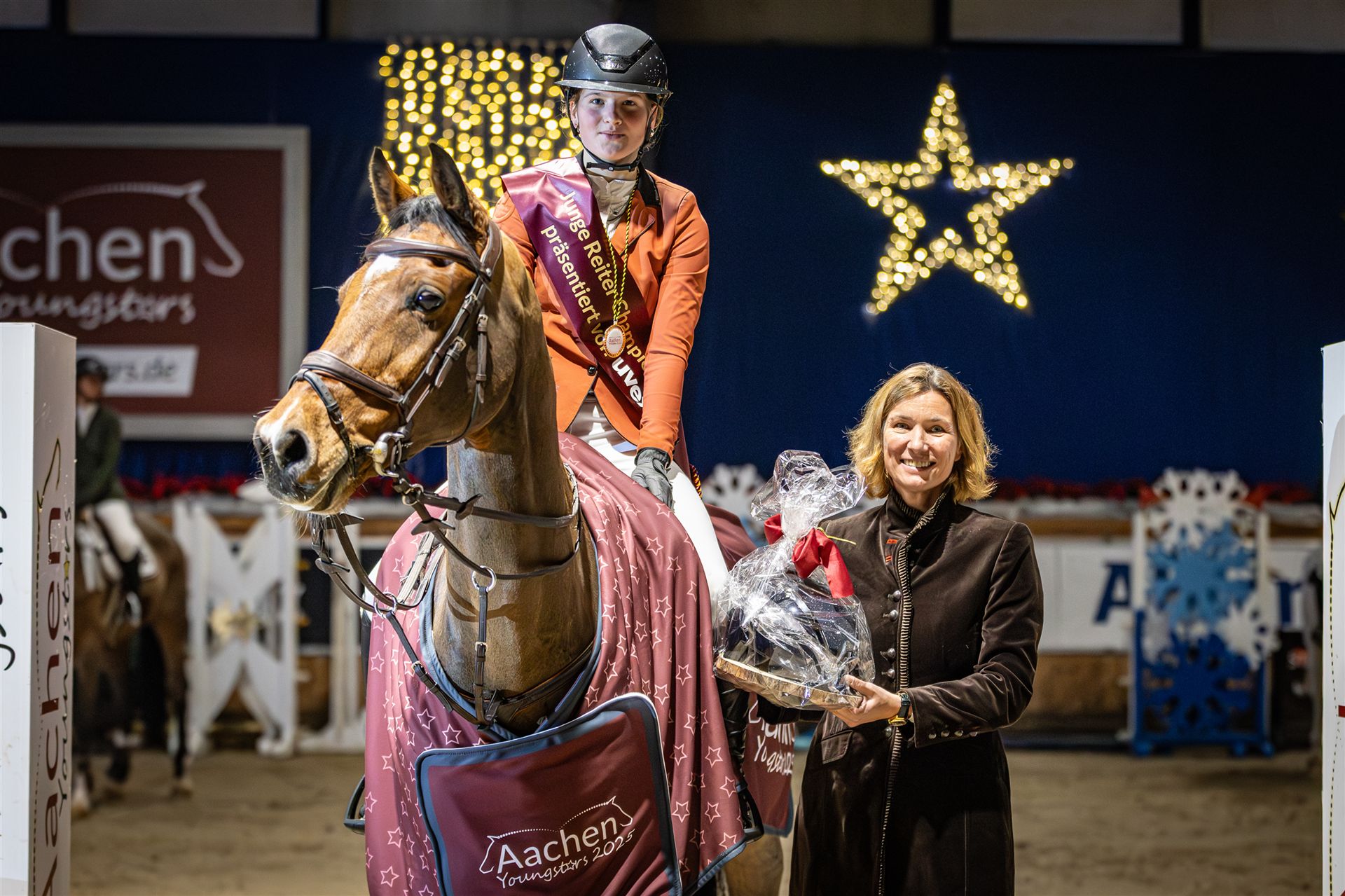 Auf den weiteren Plätzen folgten Romy Rosalie Tietje (Schleswig-Holstein) mit Cascadino, die sich mit einer ebenfalls fehlerfreien, aber etwas langsameren Runde den zweiten Rang sicherte, sowie Marie Flick (Bayern) mit Ciro, die sich über den dritten Platz freuen durfte. Auch für Romy Rosalie Tietje verlief das Turnier äußerst erfolgreich: Mit konstant starken Leistungen während des gesamten Wochenendes wurde sie zur Hallen-Championesse der Jungen Reiter präsentiert von UVEX gekrönt. Begeistert berichtete sie: „Ich habe mich unfassbar auf dieses Turnier gefreut und hatte eine tolle Saison mit meinem Cascadino, den ich schon seit sieben Jahren reite.“