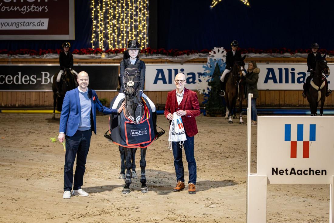 Laura Hertz-Eichenrode aus Hannover gewinnt den NetAachen-Preis, eine Ponyspringprüfung der Klasse M. Die 16-Jährige legte mit ihrem Casper eine fehlerfreie Runde in 58,46 Sekunden hin. Damit entschied sie die zweite Prüfung des Tages in der festlich geschmückten Albert-Vahle-Halle für sich. Nach dem Ritt galt das Lob ihrem bereits 20-jährigen Ponywallach: „Ich bin heute sehr stolz auf Casper, er hat das richtig gut gemacht. Er war heute sehr gut drauf, sehr schnell wie immer und hatte richtig viel Energie!“