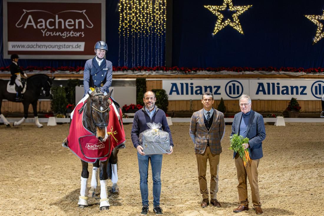 Zweite wurde die ebenfalls für Frankfurt qualifizierte Dante Weltino-Tochter Dante’s Pearl, die von ihrer Reiterin Charlott-Maria Schürmann sehr gefühlvoll in Szene gesetzt wurde (72,801 %). Auf Rang drei reihte sich Julia de Ridder im Sattel des neun Jahre jungen in Westfalen gezogenen Hengstes Birkhofs Diamantinos ein (71,135 %). „Ich hoffe, dass wir morgen nochmal einen raushauen können“, blickte Thomas Wagner unmittelbar nach der Siegerehrung auf den morgigen Freitag voraus. Dann steht für die Nachwuchspferde mit dem Preis der Familie Simons-de Ridder der „lange“ Grand Prix auf dem Programm.
