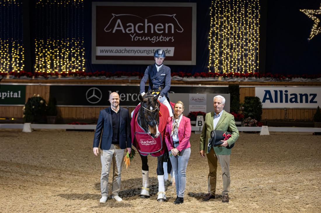 In der dritten Prüfung für junge Pferde, die bei den diesjährigen Aachen Dressage Youngstars zum zweiten Mal an den Start gehen durften, setzt sich der Vortagessieger durch: Thomas Wagner und Escolar’s Emil gewinnen mit 73,767 Prozent auch den Preis der Familie Simons-de Ridder. „Die Generalprobe ist geglückt und es war richtig schön, in Aachen reiten zu dürfen – vor allem in dieser toll geschmückten Halle, die ein bisschen das Flair von Frankfurt hat. Für uns war es der erste Grand Prix, alles hat wunderbar funktioniert, und ich bin wirklich sehr stolz auf seine Leistung“, freute sich der Sieger nach seiner Ehrenrunde in der festlich dekorierten Albert-Vahle-Halle im Allianz Park. Auf Rang zwei landeten Tobias Nabben und Forster 16 (72,633), den dritten Platz belegte Emma Caecilia Lienert mit Windermere J'Obei W (66,800).