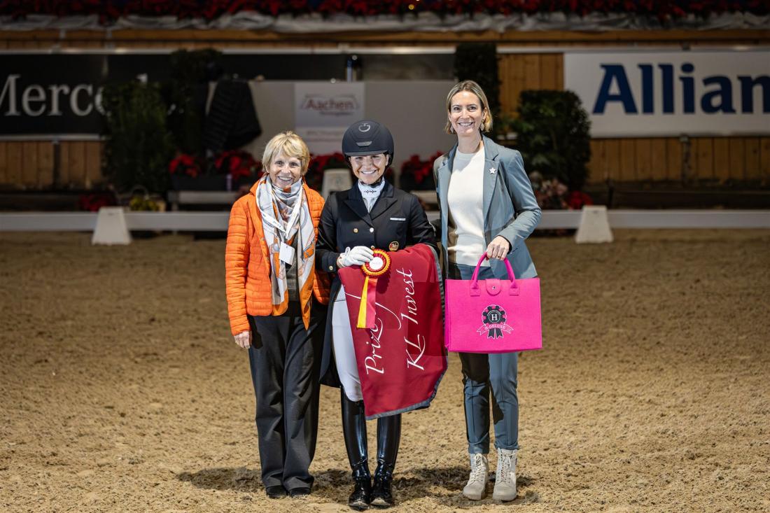 Der Siegerin im Preis der KL Invest, Charlott-Maria Schürmann, gratulieren Katrina Wüst (Richterin) und Jana Kun (Turnierleitung).