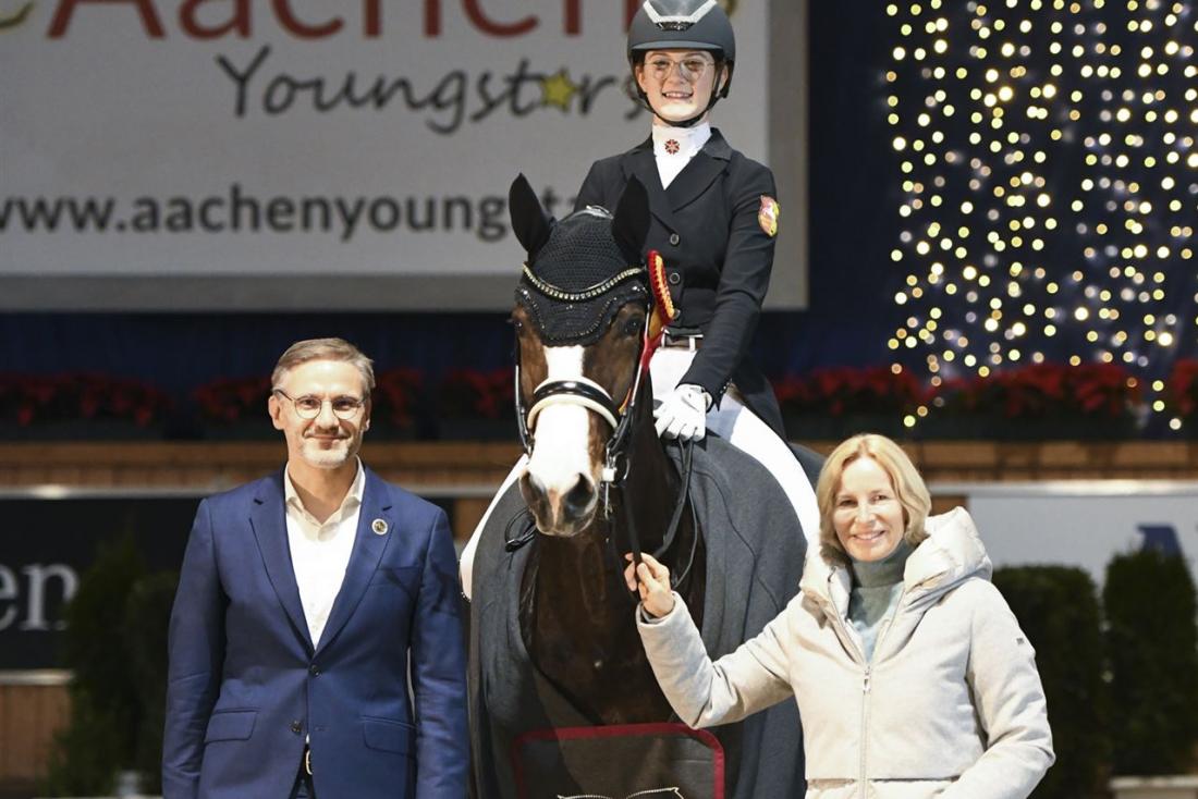 However, Leonie Koch was already overwhelmed by her emotions after her final salute. 72.980 percent meant not only a new personal best, but also victory in the Prize presented by Nadine Capellmann. "I didn't expect that at all," said the beaming winner, who initially held her hands in front of her face in disbelief. "My parents are from Aachen by birth, we are here every year at the CHIO. To even be allowed to ride here ourselves once is already a dream and now we have actually won." By we, she means her sport partner Antara, who belongs to her sister Hannah. "Antara did a great job of concentrating today and worked super for me," the 17-year-old was really thrilled with the performance of the eight-year-old mare. However, she doesn't feel any pressure for the following days at the Aachen Youngstars: "Nobody can take today's victory away from me. Now it is simply my goal that she continues to be so relaxed in the dressage arena and that I can experience the great riding feeling from today once again." That was enough for today's victory ahead of Carolina Miesner with Exclusiv (72.576%) and Emma Nielen with Fazz vh Bloemenhof (72.525%), who completed the German triple success.