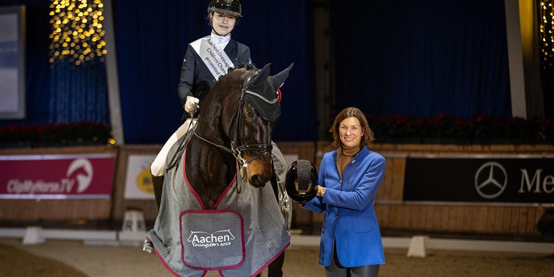 In the end, Lynn Greven was almost speechless. No wonder, because the days leading up to the journey to the Aachen Soers were already very emotional for the 14-year-old. Her top horse Falcon HP, with whom she won the title at the Rhineland Championships this summer, fell ill shortly before the start of the show. Fortunately, the 10-year-old is now in top condition again, but as a result was no longer considered for a start at the Aachen Dressage Youngstars. The experienced 17-year-old Stedinger offspring Sergio, owned by her trainer Nathalie Braun, stepped into the breach. And he gave his young rider an early Christmas present in the arena of the Albert-Vahle-Arena: The judges awarded a whopping 77.834 percent for the harmonious round that the pair conjured up in the Aachen sand early on Sunday morning. "He simply gave everything for me," beamed Lynn Greven after her ride, which not only gave her victory in the prize of federal promotion of children dressage sports, but also the title of Indoor Champion. Did she feel a home advantage? "More like a bit of pressure," laughed the young rider from Roetgen, who was taking part in the Aachen Dressage Youngstars for the first time. "Being allowed to ride here is really something very special."