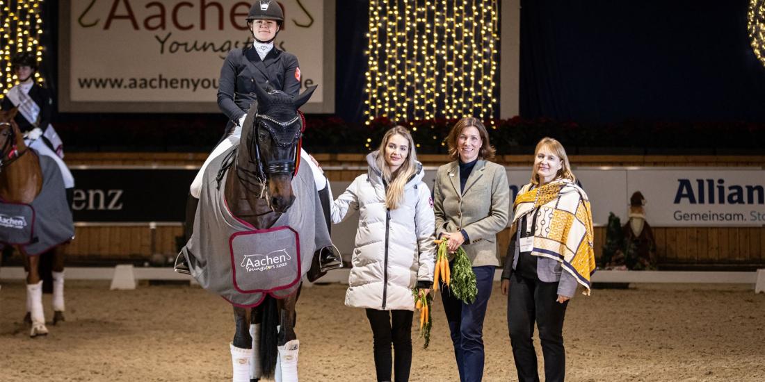 Theresa Nabbefeld's freestyle went like clockwork. The young Westphalian showed off the strengths of her 13-year-old sport partner Devalero to the sounds of Disney's Vaiana. "It was an incredible ride today," beamed Theresa Nabbefeld. "My horse felt fantastic and we were super in tune with the music throughout the entire freestyle." The three judges agreed and rewarded the pair's performance with a new personal best of 74.842 percent. "And that was enough to relegate the winner of the two previous days, Emma Caecilia Lienert and her Express (74.275 percent), to second place. Theresa Nabbefeld's joy was correspondingly great: "This is my first time here in Aachen. The atmosphere in this arena is really very special and I am over the moon that we are able to be right at the front here today." For Theresa Nabbefeld, the victory in the Prize of Family Hans-Peter Simons was also a golden end to her time as a young rider: "This is a very emotional moment for me." A member of the CHIO Aachen CAMPUS Excellence Program, Laura Lausten from Sweden and Fairy Tale, was delighted with third place.