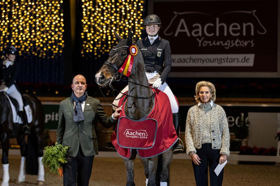 For Alix von Borries and her nine-year-old Fürstenball OLD daughter Feingefühl, the name says it all. The 18-year-old presented her elegant dark bay mare with finesse and a great deal of feeling in the 2nd Young Riders classification. A ride in which everything went well. No wonder the young Rhinelander went into raptures immediately after the festive award ceremony in the festively decorated Albert-Vahle-Arena: “I couldn't be happier,” said the talented rider. “This is my first international event in this age group. And then to win straight away in front of this fantastic backdrop really leaves me speechless.” Behind Alix von Borries, who was awarded 70.980 percent by the jury, came Dutch rider Yasmin Westerink and Amphitryon OLD (69.951 %), a pair who prepared for the show in Aachen together with Head Coach Isabell Werth in the current year of the CHIO Aachen CAMPUS Programme of Excellence. Third-placed Jette de Jong from Belgium also knows how instructive training with the most successful dressage rider of all time and CHIO Aachen record winner is. The 20-year-old and her KWPN gelding Heavenly Charming took part in the 2023/2024 class of the CHIO Aachen Programme of Excellence.