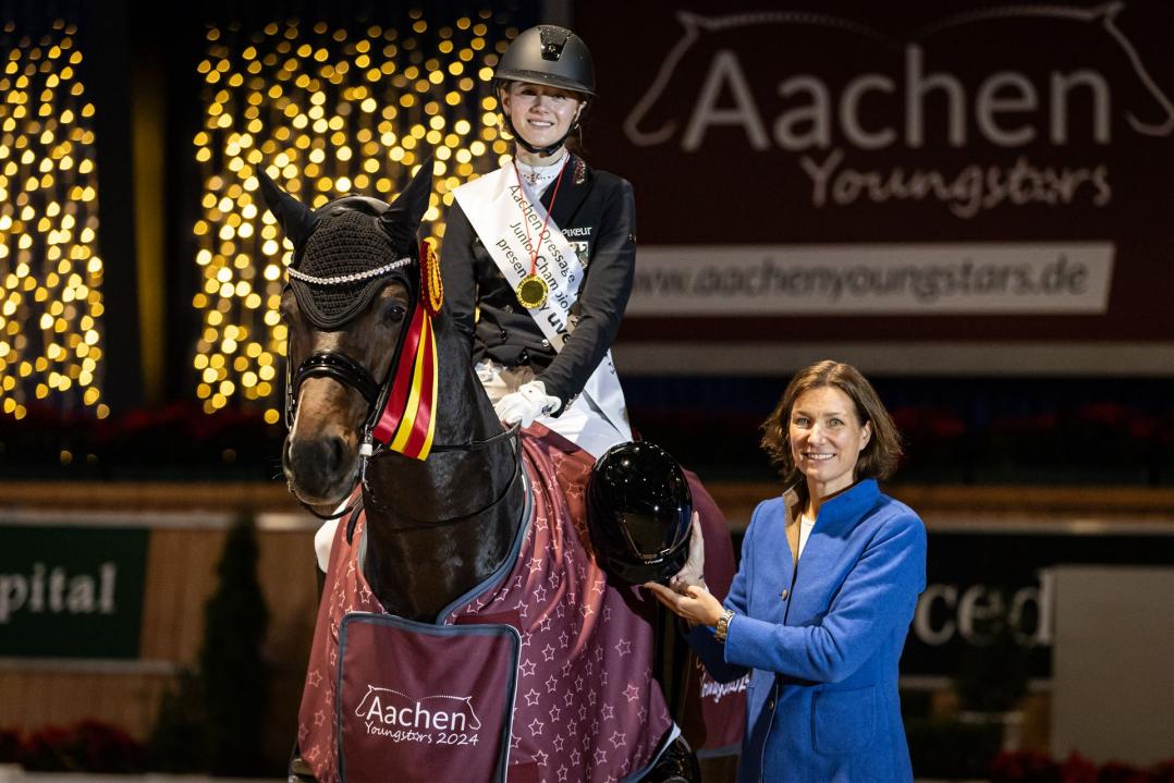 "It's a beautiful day and I can't stop myself from smiling" - Lilly Marie Collin had already set the right mood for the final day of the Aachen Dressage Youngstars with her freestyle music. With a score of 76.083 per cent and a personal best, the 17-year-old not only secured victory in the WOTAX-Prize in the last competition of 2024, but also crowned herself Junior Indoor Champion 2024 presented by UVEX. She had achieved this coup in the pony riders' camp in 2023, and now, after three victories in three competitions, she had successfully completed her career in the juniors. "It's indescribable, I didn't expect it at all and I'm incredibly proud of my horse. We've had a lot of ups and downs this year and I'm all the happier that we've done so well here," beamed the Rhinelander after two rounds of honour in the Christmassy Albert-Vahle-Arena. According to his rider, her stallion Famous K FRH now has a well-deserved break. "He gets lots of carrots and mash and then it's on to the winter work. I'm looking forward to the coming season," said a delighted Lilly Marie Collin.