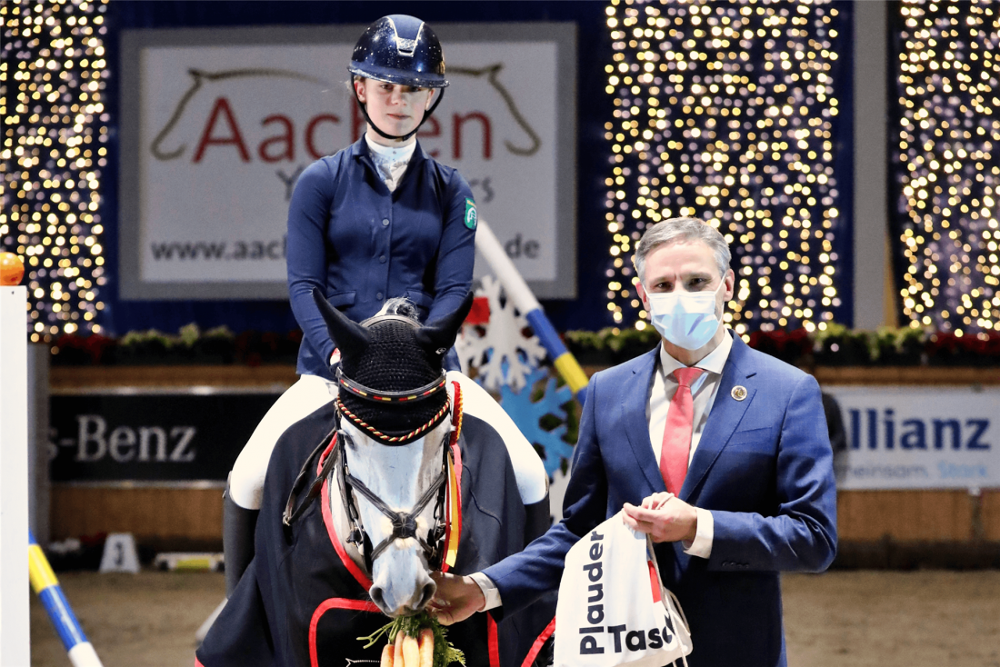 Jonna Esser und ihrer Ponystute Catness gelang heute die schnellste fehlerfreie Runde in einer Zeit von 60,23 Sekunden. "Catness sprang heute wieder sehr gut, sie hat alles gegeben und gekämpft. Es hat einfach Spaß gemacht", so die 14-Jährige. Für die Rheinländerin war es der erste Sieg beim Aachen Jumping Youngstars, gerechnet hatte sie damit nicht: "Ich bin einfach froh, hier reiten zu dürfen. Es ist ein tolles Turnier, super geschmückt und die Atmosphäre ist super." Jonna hofft, dass sie mit ihrem "besten Pony der Welt" heute genug Punkte geholt hat, um morgen beim Finale im NetAachen-Preis an den Start gehen zu dürfen. "Dann möchte ich nochmal eine schöne Runde mit ihr drehen", so die amtierende Deutsche Meisterin der Ponyreiter.