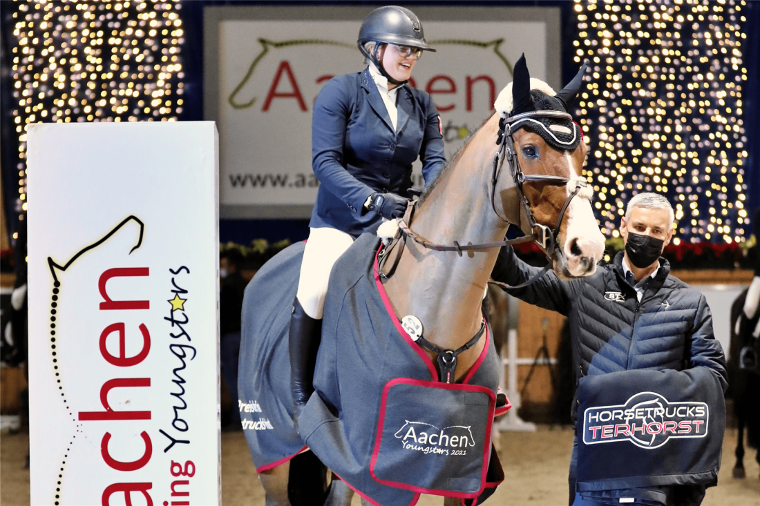 Der erste Sieg bei den Aachen Jumping Youngstars geht 2021 nach Westfalen: Hannah-Michelle Wilken vom Reitverein Warendorf siegte mit Never Mind im Preis der Fa. Horsetrucks Terhorst.
