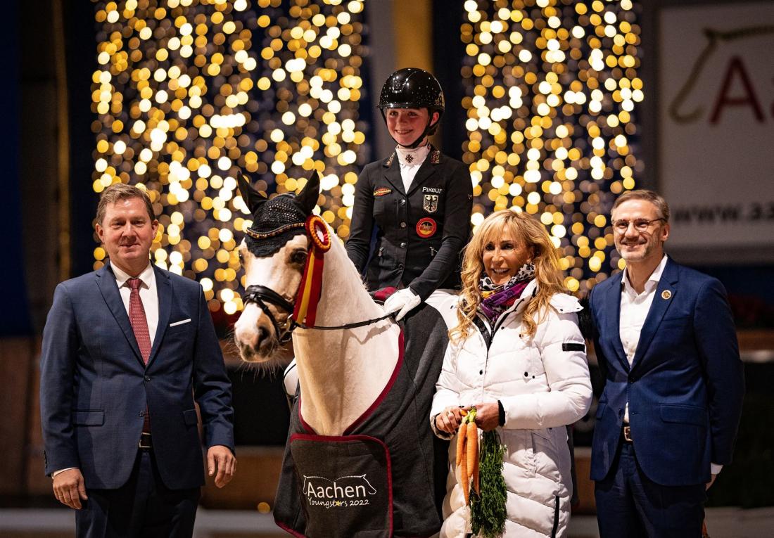 Die Aachen Dressage Youngstars sind einfach ihr Turnier: Die Hallen-Championess der Jahre 2019 und 2021 ist auch diesmal in der Auftaktprüfung der Ponyreiter das Maß der Dinge