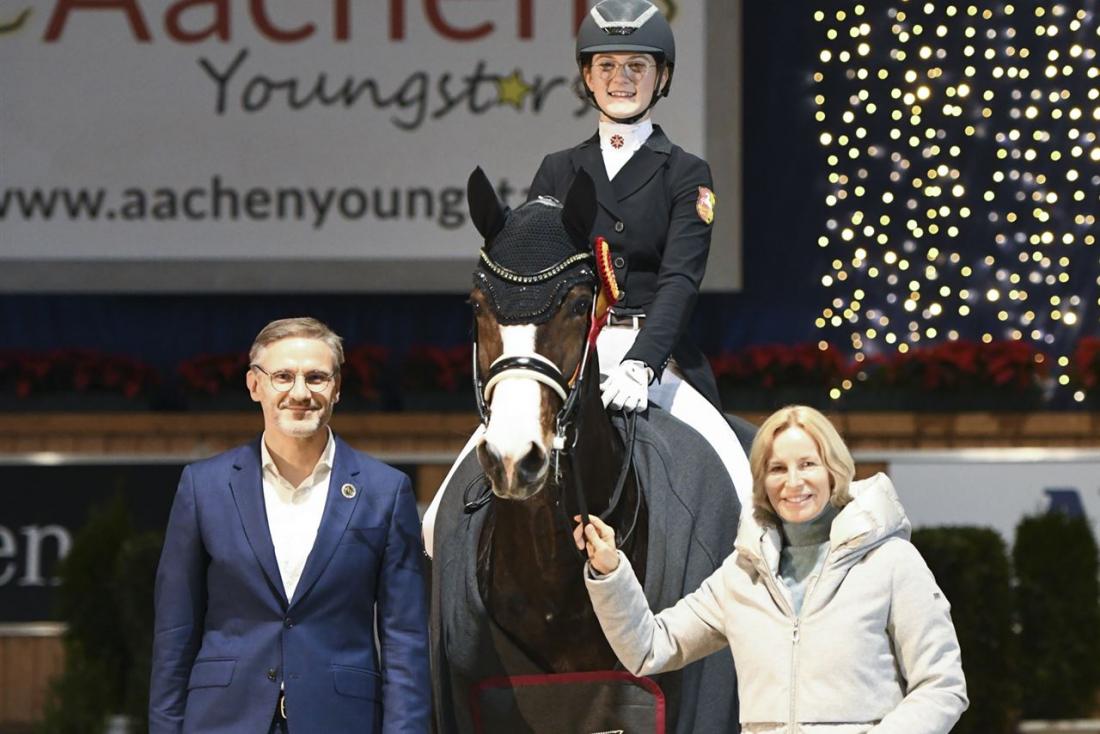 Von ihren Emotionen überwältigt war Leonie Koch aber bereits nach ihrem Schlussgruß. 72,980 Prozent bedeuteten nicht nur eine neue persönliche Bestleistung, sondern auch den Sieg im Preis der Frau Nadine Capellmann. „Damit habe ich überhaupt nicht gerechnet“, so die strahlende Siegerin, die sich zunächst ungläubig die Hände vor das Gesicht hielt. „Meine Eltern kommen gebürtig aus Aachen, wir sind jedes Jahr hier beim CHIO. Überhaupt hier selbst einmal reiten zu dürfen, ist schon ein Traum und jetzt haben wir tatsächlich gewonnen.“ Mit wir meint sie ihre Sportpartnerin Antara, die ihrer Schwester Hannah gehört. „Antara hat sich heute toll konzentriert und super für mich mitgearbeitet“, war die 17-Jährige von der Leistung der acht Jahre alten Stute richtig begeistert. Druck für die nachfolgenden Tage bei den Aachen Youngstars verspürt sie aber nicht: „Den Sieg heute kann mir keiner mehr nehmen. Jetzt ist es einfach mein Ziel, dass sie weiterhin im Viereck so entspannt bleibt und ich das tolle Reitgefühl von heute noch einmal erleben darf.“ Das nämlich reichte heute für den Sieg vor Carolina Miesner mit Exclusiv (72,576 %) und Emma Nielen mit Fazz vh Bloemenhof (72,525 %), die den deutschen Dreifach-Erfolg komplett machten.