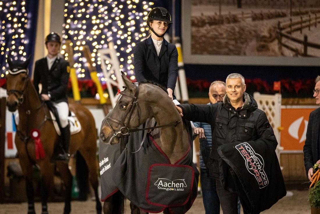 Der erste Sieg bei den Aachen Jumping Youngstars geht 2022 nach Rheinland-Pfalz: Naomi Himmelreich vom PSV Kördorf siegt mit Chiara im Preis der Firma Horsetrucks Terhorst.