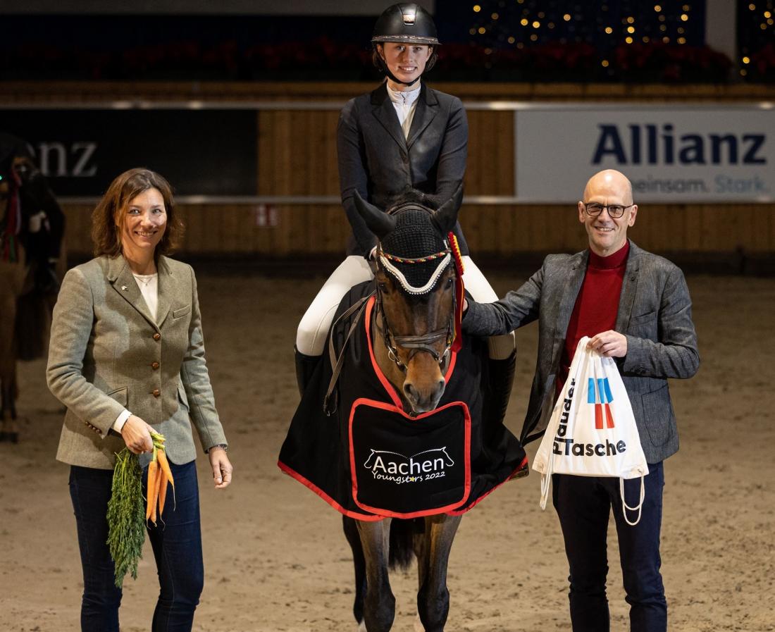 Der Siegerin gratulieren: Stefanie Peters, Präsidentin des Aachen-Laurensberger Rennvereins, und Andreas Schneider, Geschäftsführer der NetAachen GmbH.