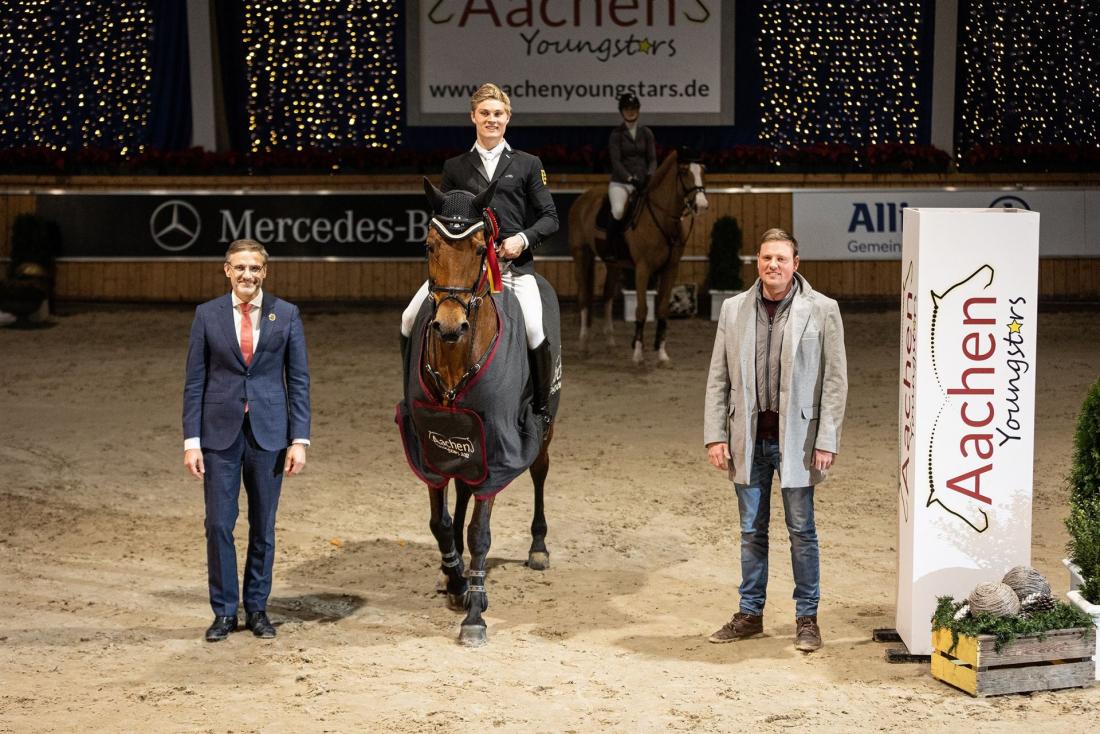 „Unfassbar, unglaublich, ich bin überglücklich“, suchte Julian Holzmann nach Worten. „Ein Sieg in Aachen, davon habe ich schon immer geträumt.“ Und jetzt ist dieser Erfolg für ihn sogar noch ein bisschen besonderer. Mit dem Sieg in der 2. Qualifikation für den Großen Preis der Jungen Reiter auf Zwei-Sterne-Niveau erfüllt der 20-Jährige nun alle Anforderungen für das Deutsche Reitabzeichen in Gold. „Das ist wirklich ein Lebenstraum, der für mich in Erfüllung geht“, so der Baden-Württemberger. „Und dass das nun hier in Aachen geklappt hat, ist einfach unfassbar schön.“ Seine Sportpartnerin im Stechen war einmal mehr die Hannoveraner Stute Iberia – damit hat er alle zehn erforderlichen Siege in der schweren Klasse mit der Iberio-Tochter gemeinsam errungen. „Ihr habe ich einfach alles zu verdanken, ich kann gar nicht sagen, wie stolz ich auf sie bin.“ Stolz waren auch die lautstarken Fans auf der vollbesetzten Tribüne, die ihren „Goldjungen“ auf der Ehrenrunde mit einer La-Ola-Welle feierten. Ein emotionaler Abend in der Albert-Vahle-Halle, den der 20-Jährige so schnell nicht vergessen wird.