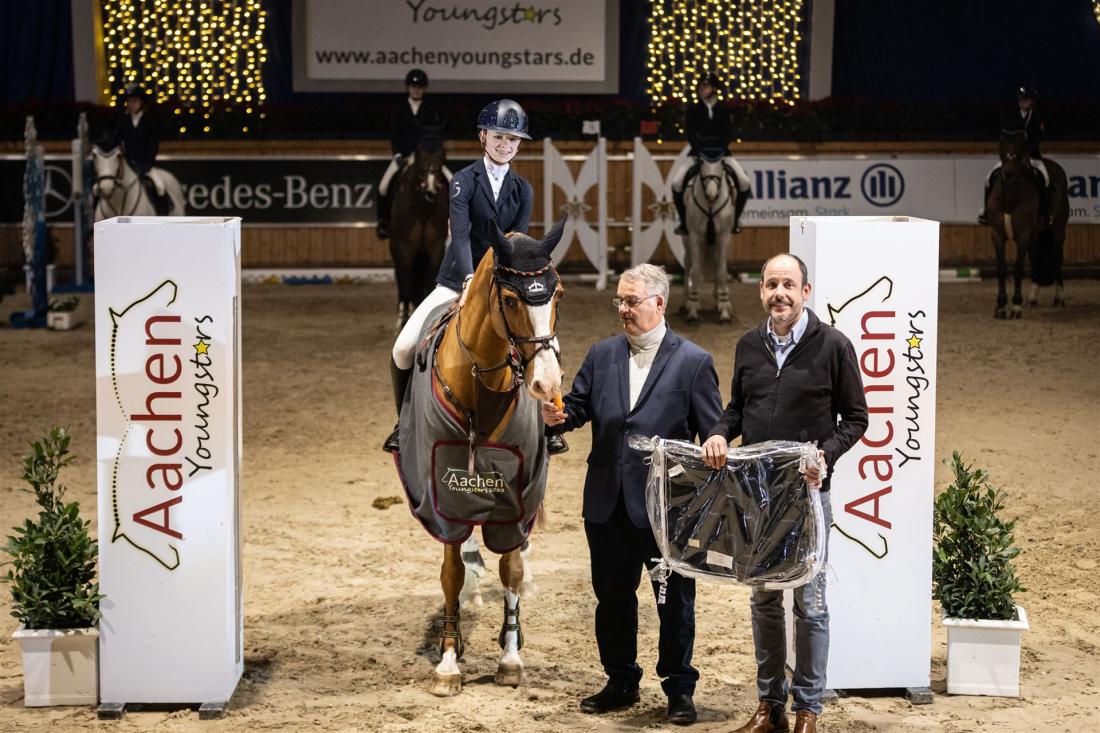 2023 ist einfach ihr Jahr. Im Sommer gehörte Jolie Marie Kühner zum Gold-Team bei den Europameisterschaften und sicherte sich zudem Bronze in der Einzelwertung. Und auch bei ihrem letzten Auftritt in der Altersklasse der Children trumpfte das Nachwuchstalent aus Bayern groß auf. Als die 14-Jährige mit ihrer Fuchsstute Queen Lathifa K als letzte Starterin den Parcours betrat, setzte sie alles auf eine Karte. Rasant und gleichzeitig in stilistisch hervorragender Manier pilotierte sie ihre Sportpartnerin durch den Stangenwald. Und als nach dem letzten Hindernis 57,75 Sekunden auf der großen Anzeigentafel prangten, war klar: Die letzten werden die ersten sein! Kein Wunder, dass die junge Reiterin mit einem großen Lächeln aus der weihnachtlich geschmückten Albert-Vahle Halle kam. „Ich bin sehr happy“, so die Tochter des international für Österreich startenden Springreit-Stars Max Kühner. „Es ist ja mein letztes Turnier in dieser Altersklasse, da möchte ich noch einmal alles geben.“ Alles gegeben hat auch einmal mehr ihre 14-jährige Stute Queen Lathifa K: „Im Umgang ist sie schon mal eine kleine Zicke“, verrät Jolie Marie Kühner. „Aber im Parcours kämpft sie immer ganz toll mit.“ Das soll im besten Fall auch im weiteren Verlauf der Aachen Jumping Jungstars so sein. „Natürlich wünsche ich mir, weiter so erfolgreich zu sein“, so die 14-Jährige. „Aber ich schaue lieber von Tag zu Tag.“ Denn, das weiß auch Jolie Marie Kühner, die Konkurrenz ist ihr dicht auf den Fersen. Allen voran ihre Team-Kolleginnen von den Europameisterschaften in diesem Sommer, Colin Sorg (Baden-Württemberg) und Brianne Beerbaum (Hannover), die mit ihren Pferden Casillas bzw. Carlucci heute die Plätze zwei und drei belegten.