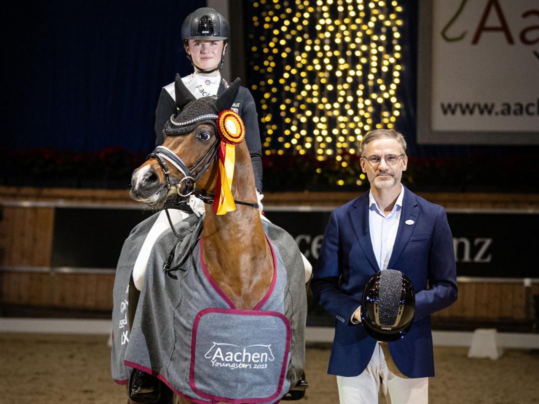 Auf der Schlusslinie, die sie im starken Trab absolvierte, wurde Lilly Marie Collin emotional. „Ich hatte mir vorgenommen, einfach Spaß zu haben. Aber dann ist mir bewusst geworden, dass dies hier wirklich unsere letzte Grußaufstellung war“, so die 16-Jährige kurz nach ihrem Ritt, während sie sich noch ein paar Tränchen aus dem Gesicht wischte. Aber es dauerte nicht lange, da überwogen bei der jungen Nachwuchsreiter wieder Freude und Dankbarkeit. Freude über die tolle Kür, die ihr gelungen war. Und Dankbarkeit, mit Cosmo Callidus NRW in den vergangenen drei Jahren ein echtes Ausnahmepony an ihrer Seite gehabt zu haben. „Er ist wirklich großartig“, so Lilly Marie Collin, die in ihrem letzten Jahr im Lager der Ponyreiter, die erfolgreichste Saison ihrer jungen Karriere erleben durfte. Dreimal Gold bei den Europameisterschaften, Weltranglistenerste und nun zum krönenden Abschluss der Sieg im Preis der Preis der BFT Cognos GmbH und der Titel der Hallen-Championess 2023, präsentiert von UVEX. Ein grandioser Abschluss eines Kapitels im Sportlerleben der Rheinländerin, die genau weiß, wem sie ihre tollen Erfolge zu verdanken hat: „Ich bin unbeschreiblich dankbar für Cosmo und die gemeinsame Zeit, die wir erleben durften. Aber gemeinsam mit meinen Eltern und meiner Trainerin freue mich jetzt auch auf das, was kommt.“ Während sie das sagt, wirft sie kurz einen sehnsüchtigen Blick in Richtung des benachbarten Deutsche Bank Stadions. „Dort einmal reiten zu dürfen, das wäre wirklich ein Traum.“