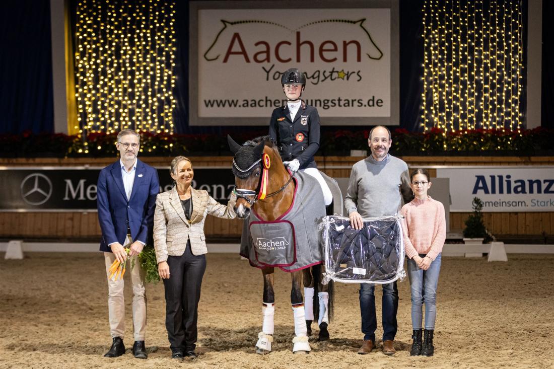 Dieser Sonntagmittag in der Albert-Vahle-Halle bot aber nicht nur für Lilly Marie Collin einen ganz besonderen Moment. Auch die beiden Reiterinnen auf den Rängen zwei und drei, die gemeinsam mit Lilly Marie Collin in diesem Sommer bei den Europameisterschaften ganz oben auf dem Treppchen standen, verabschiedeten sich mit ihrer Darbietung in der weihnachtlich geschmückten Arena aus der dem Lager der Ponyreiter. Und, na klar, auch bei Julie Sofie Schmitz-Heinen (79,458 Prozent) und bei Mia Allegra Lohe (77,725 Prozent) flossen nach dem Schlussgruß Tränen, bevor auch sie froh und dankbar waren, mit Chilly Morning WE bzw. Tovdal's Golden Future Imperial so tolle Sportpartner an ihrer Seite gehabt zu haben.