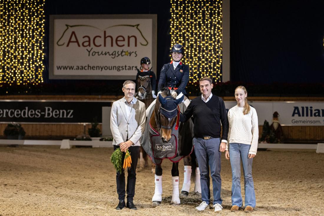 Für die Dressurreiterin aus Glastonbury ist es ihr erstes Turnier in Aachen. Mit strahlendem Gesicht kommentierte die 15-Jährige den aufregenden Moment: „Er ging rein und war einfach Feuer und Flamme. Ich bin so zufrieden mit ihm.“ Dabei hat sie den 14-Jährigen Wallach erst seit August letzten Jahres: „Er ist einfach brillant und so liebenswert.“ Zweite wurde die Niederländerin Anique Frans und ihr imposanter Jack Sparrow mit 70,588%. Bronze ging nach Dänemark: Für Johanne Kofod Jensen und Frida Gold 5 gab es tolle 70,294%.