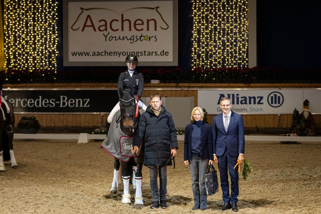 Der Siegerin Clara Paschertz und ihrem Trainer Dirk Heyse gratulieren Nadine Capellmann und ALRV-Aufsichtsratsmitglied Dr. Thomas Förl.
