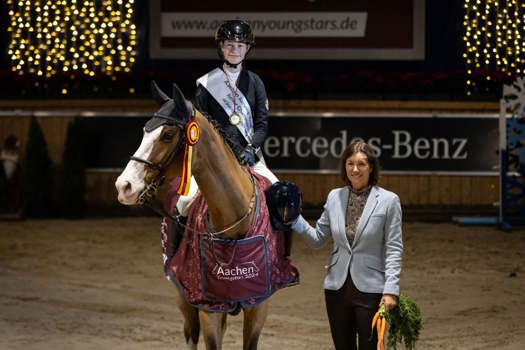 Die gute Mischung hatte Luise Konle mit Dressed For Success an den vier Tagen der Aachen Jumping Youngstars augenscheinlich auch gefunden, denn sie krönte sich mit dem zweiten Platz im STAWAG-Preis zur Junioren Hallen-Championesse 2024 präsentiert von UVEX. "Es ist unglaublich, ich habe gar nicht damit gerechnet", sagte sie noch etwas ungläubig nach der Ehrenrunde mit der begehrten Schärpe. "Mein Pferd hat alles für mich gegeben und ich bin super happy. Auf ihn ist immer Verlass, er ist mein bester Freund", fand sie rührende Worte für ihren Sportpartner, mit dem sie in den vergangenen Tagen in Aachen so erfolgreich gewesen ist.