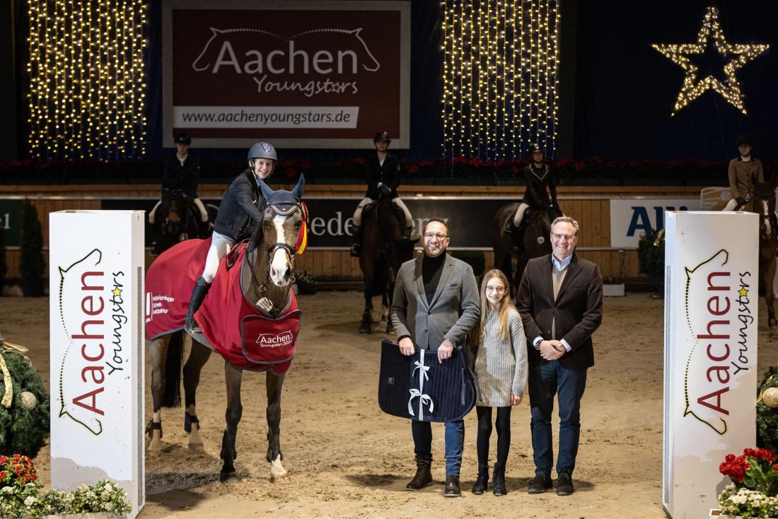 Der Siegerin gratulieren Stefan und Lisa Mohr (Geschäftsführer der Firma Wohn- und Raumkonzepte Mohr und Tochter) und Dr. Stephan Kranz (Aufsichtsratsmitglied des Aachen-Laurensberger Rennvereins).