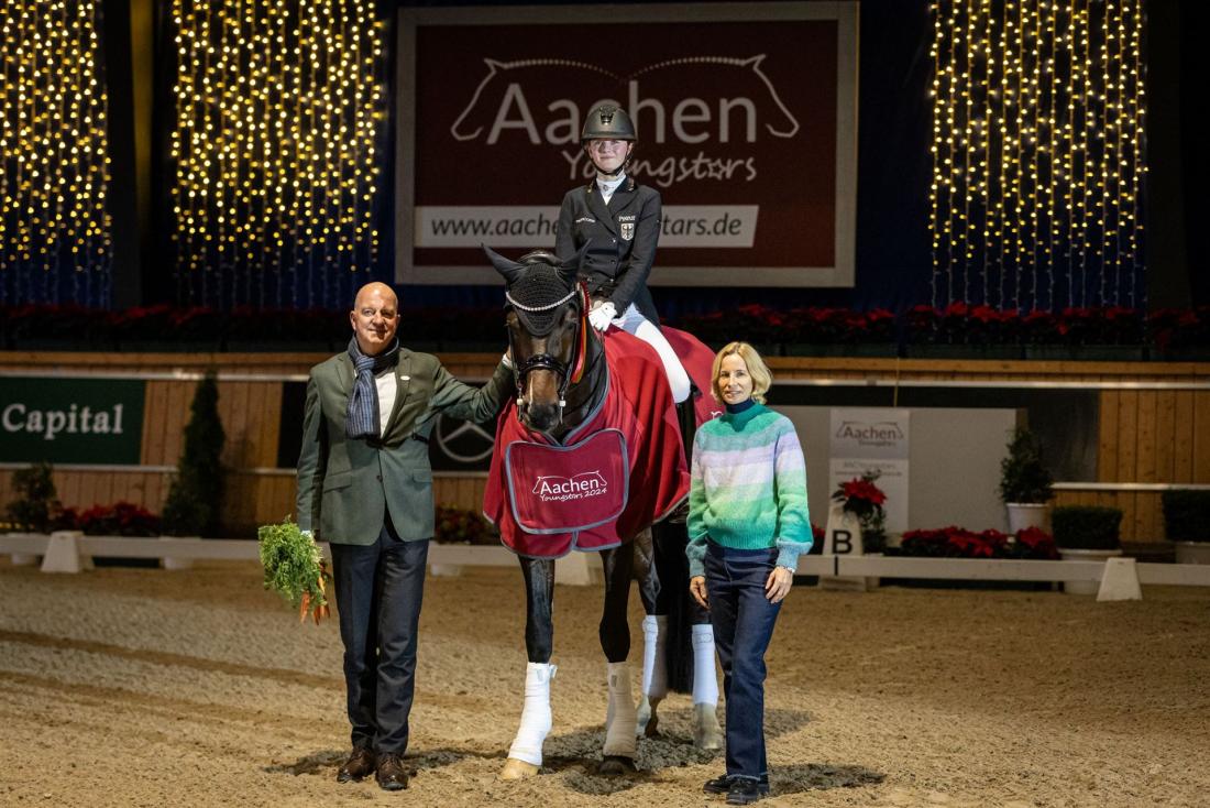 Schon beim Abwenden auf die finale Mittellinie huschte ein stolzes Lächeln über das Gesicht von Lilly Marie Collin. Zurecht! Die fünffache Europameisterin der Ponyreiter, die im vergangenen Jahr bei den Aachen Dressage Youngstars ihre Ponyzeit mit dem Titel der Hallen-Championesse krönte, ist angekommen im Lager der Junioren. Und wie! Im Sattel des neunjährigen Finest-Nachkommen Famous K FRH zauberte die 17-Jährige eine harmonische und technisch fehlerfreie Prüfung in den Aachener Sand. „Ich bin richtig happy“, so die junge Nachwuchsreitern unmittelbar nach der feierlichen Siegerehrung in der weihnachtlich dekorierten Albert-Vahle-Halle, während sie ihrem Sportpartner anerkennend auf den Hals klopfte. „Mein Pferd hat mir heute in der Prüfung ein richtig gutes Gefühl gegeben.“ Und dieses gute Gefühl spiegelte sich auch in der Bewertung der Jury wider, die die Leistung der beiden mit stolzen 73,232 Prozent belohnte.