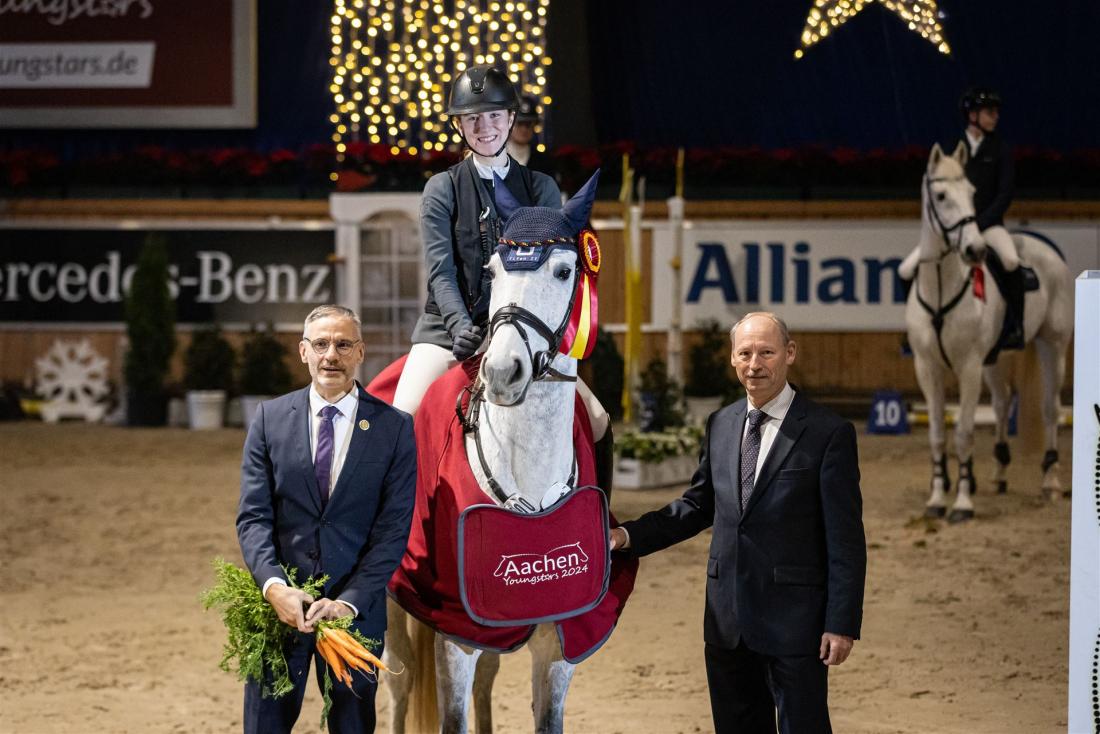 Die beiden sind einfach ein eingespieltes Team: Vieca Sofie Bade wusste genau, wie viel Risiko sie im Sattel ihres Herzenspferdes Chades of Grey eingehen kann. Und sie wusste, wie viel Risiko sie eingehen musste, um ihre 44 Mitstreiter auf Distanz zu halten. Immer im Rhythmus bleibend und in einer hohen Frequenz galoppierend, pilotierte das 16-jährige Talent aus Schleswig-Holstein ihre 12-jährige Schimmelstute durch den anspruchsvollen Parcours. „Sie hat ein wahres Kämpferherz“, beschreibt der 16-Jährige ihre Sportpartnerin, die sie im Jahr 2022 bereits im Lager der Children zur Team-Goldmedaille bei den Europameisterschaften getragen hat. „Im Parcours versucht sie immer, aus jeder Situation das Beste zu machen.“ Kein Wunder also, dass die Uhr nach einer blitzsauberen Runde bereits nach 63,48 Sekunden stoppte. Das bedeutete den Sieg in der 2. Wertungsprüfung der Junioren. Hendrik Greve aus Mecklenburg-Vorpommern verteidigte mit seinem sprunggewaltigen Schimmel Karat du Plessis bis zum Schluss Rang zwei (0/65,28), Dritter wurde der Saarländer Fabio Thielen im Sattel von Clarino De Luxe (0/66,71). Am morgigen Sonntag steht für die Junioren die Entscheidung um den Hallen-Champion, presented by UVEX, an. Es wundert wenig, dass Vieca Sofie Bade auch dabei gerne ein Wörtchen mitreden möchte. „Ich werde es ganz locker angehen“, so die junge Nachwuchsreiterin vom RFV Wilhelminenhof Ladelund. „Wir geben einfach wieder unser Bestes und schauen dann, wofür das reichen wird.“