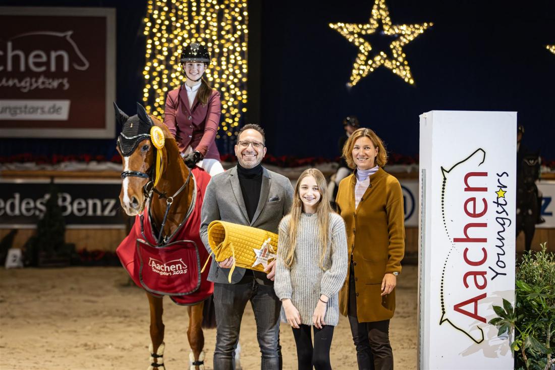 Nach einer hervorragenden Wertungsnote von 8,2 im ersten Umlauf qualifizierte sich die 15-Jährige für die entscheidende Siegerrunde der besten zehn. Mit ihrer Fuchsstute Carazza gelang ihr die schnellste fehlerfreie Runde in 41,81 Sekunden. „Ich bin sehr stolz, wie Carazza in der Siegerrunde für mich gekämpft hat, vor allem auch beim letzten Sprung. In dem Moment hätte ich nicht gedacht, dass wir ohne Fehler ins Ziel kommen“, so die junge Amazone nach ihrem Ritt. „Letztes Jahr war ich schon einmal hier, da bin ich mit meiner anderen Stute Zweite geworden. Ich bin sehr stolz und glücklich, dass es heute zum Sieg gereicht hat.“